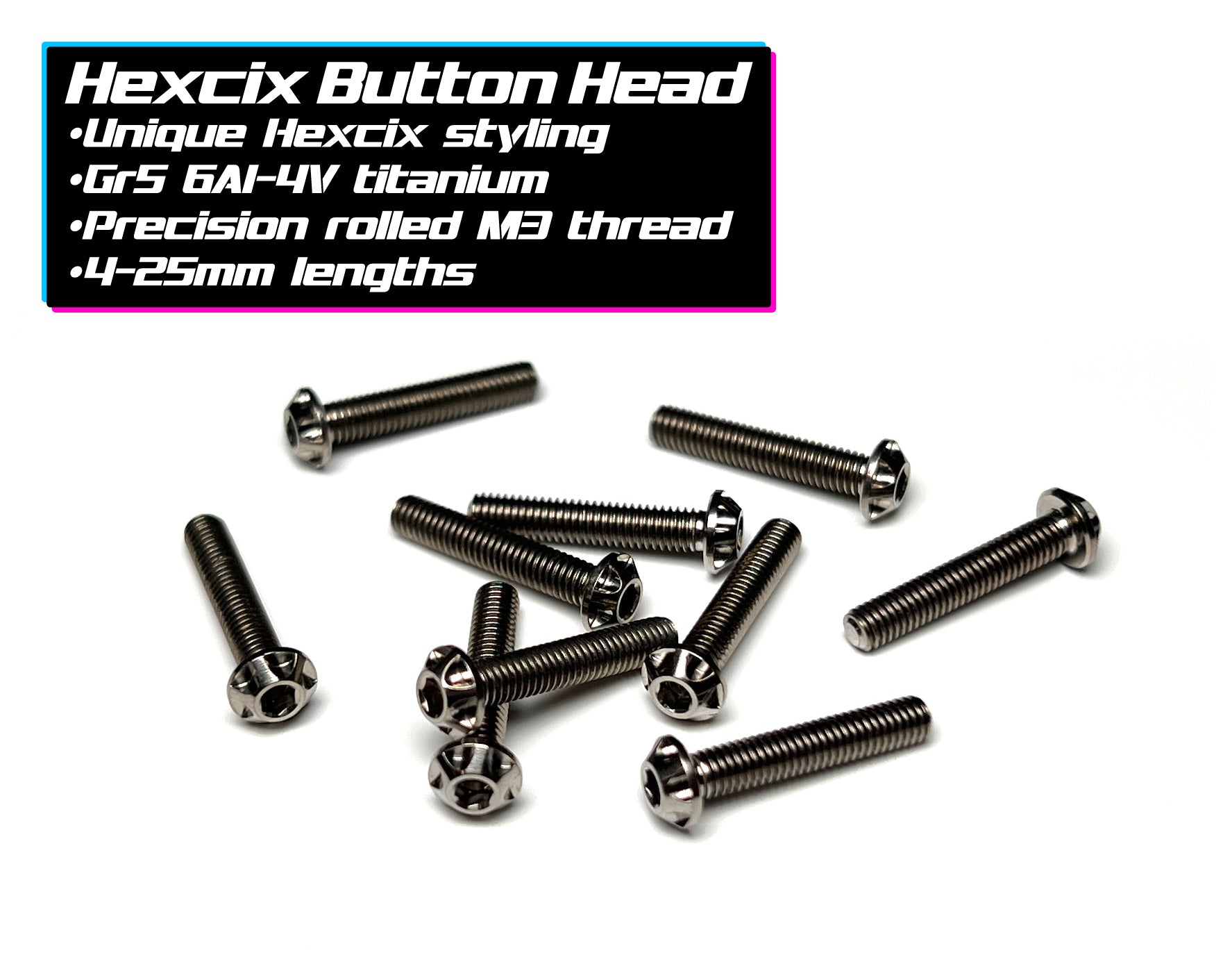 Our most unique button head screw. Precision machined from gr5 6AL-4V titanium. The Hexcix button head is sure to make your next build stand out.